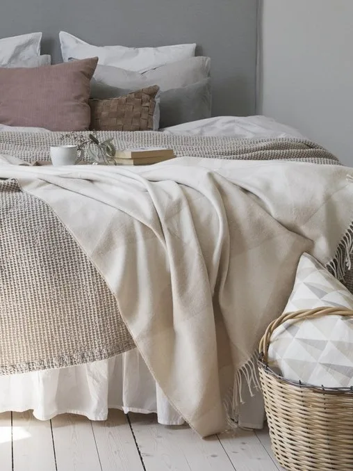 Koce są nie tylko świetne do ogrzewania się podczas chłodnego letniego wieczoru, ale również mogą służyć jako stylowe akcesoria do domu. Połóż złożony koc na końcu swojej szarej kanapy, aby dodać jej więcej życia i koloru do salonu. Albo rzuć koc na róg białego łóżka, aby nadać mu trochę potrzebnego charakteru.
