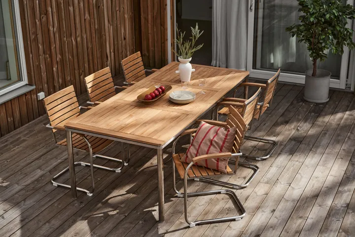 Stół Rörvik od szwedzkiej marki 1898 to stół ogrodowy z drewna tekowego i stali nierdzewnej, z miejscem dla przyjaciół i rodziny. Ryflowany blat stołu jeszcze bardziej podkreśla strukturę drewna, tworząc ciepłe i przytulne wyrażenie. Nieobrabiane drewno tekowe nie wymaga konserwacji i z czasem nabierze pięknej patyny. Twórz wspaniałe wspomnienia na patio podczas leniwych dni urlopu i słodkich letnich wieczorów.