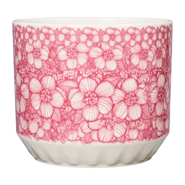 Doniczka Huvila z Arabia to doniczka wykonana z porcelany, która z pięknym wzorem staje się ładnym detalem w domu. Wzór został stworzony przez fińską projektantkę i ceramika Heini Riitahuhta. Inspiracja pochodzi z jej wspomnień z dzieciństwa z domu babci i atmosfery, która tam panowała. Różowy kolor wzoru z dzikimi różami to także ulubiony kolor babci. Efektem jest romantyczny kwiatowy wzór w nowoczesnej interpretacji. Doniczka Huvila to detal wnętrza, który wywołuje radość, zwłaszcza gdy jest uzupełniona pięknymi kwiatami.