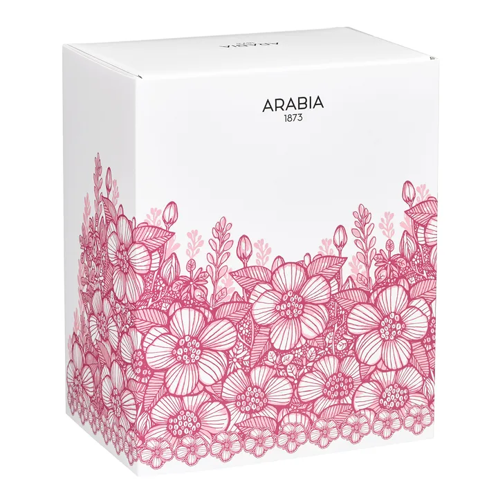 Wazon Huvila z Arabii dzięki swojemu pięknemu wzorowi kwiatowemu stanowi elegancki element stołu. Wzór został stworzony przez fińską projektantkę i ceramik Heini Riitahuhte. Inspiracja pochodzi z jej dziecięcych wspomnień z domu babci i panującej tam atmosfery. Różowy kolor na wzorze z dzikimi różami to także ulubiony kolor babci. Efektem jest romantyczny wzór kwiatowy w nowoczesnej interpretacji.