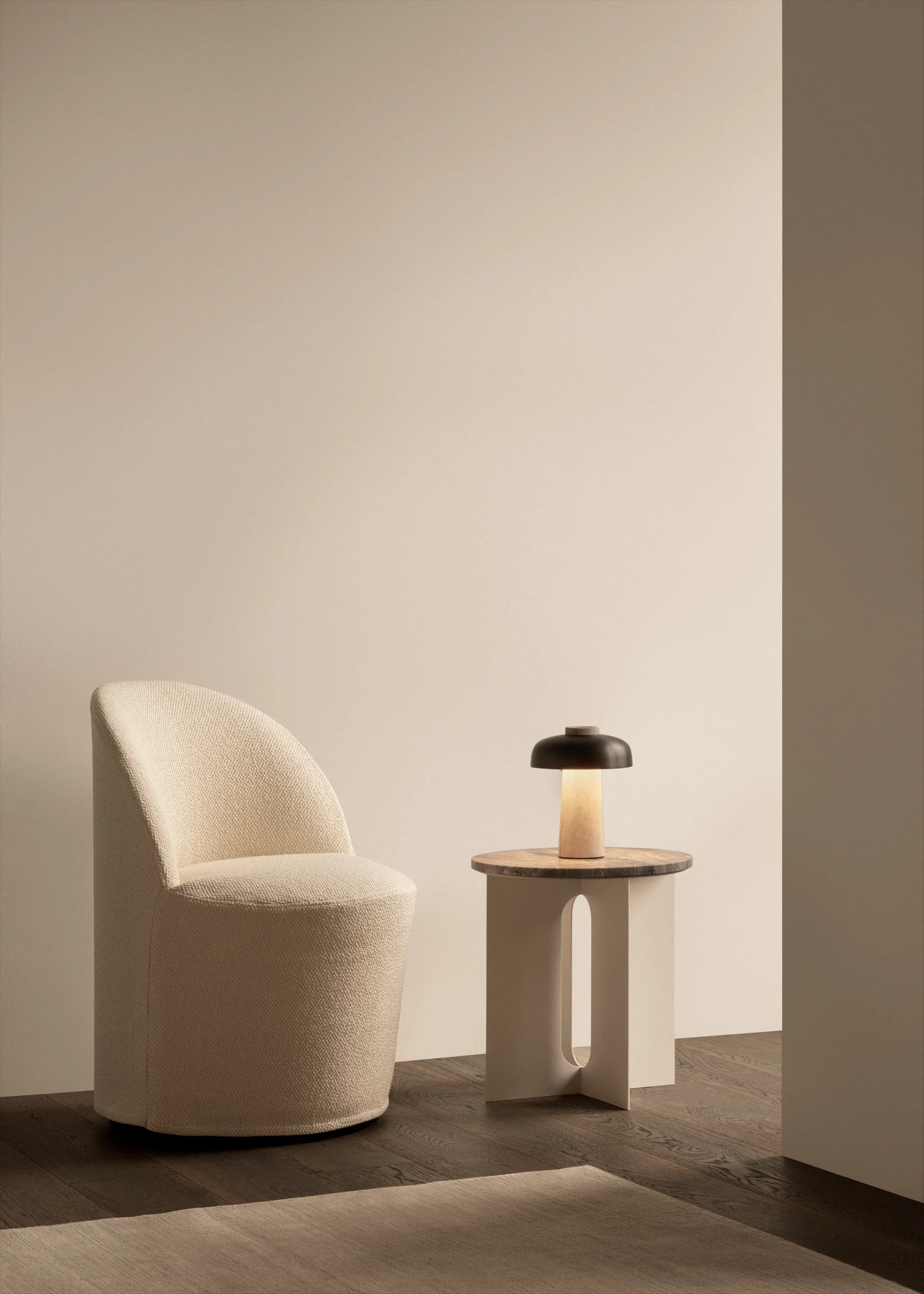 Przenośna lampa stołowa Reverse 24,5 cm od Audo Copenhagen harmonijnie łączy surowe i wyrafinowane materiały. Stożkowa podstawa z nieobrobionego kamienia posiada naturalne niuanse, które podkreślają jej organiczne piękno, natomiast zakrzywiony klosz z brązowanego aluminium tworzy elegancki kontrast. Opalowy dyfuzor rozprasza miękkie i równomierne światło, idealne do stworzenia przytulnej atmosfery. Dzięki trzem poziomom ściemniania lampa dostosowuje się do różnych potrzeb i doskonale sprawdzi się zarówno na stoliku kawowym, jak i na tarasie. Jest to lampa przenośna, którą należy przechowywać w pomieszczeniach, gdy nie jest używana, aby wydłużyć jej żywotność.