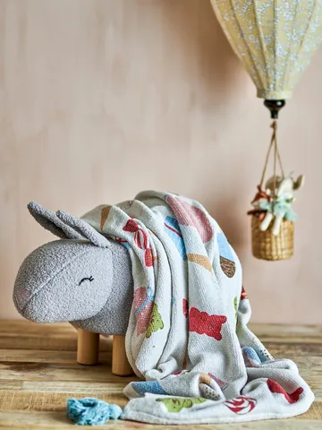 Koc Sweets 130x160 cm od Bloomingville to przytulny koc wykonany z bawełny z recyklingu z kolorowymi motywami prezentów, słodyczy i lodów. Zabawne ilustracje tworzą radosną atmosferę, a frędzle w rogach dodają dodatkowego uroku. Idealny do ogrzania dzieci lub jako świąteczny element dekoracyjny.