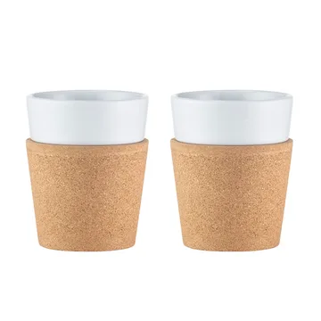Podawaj gorące napoje w stylowych i praktycznych kubkach Bistro z korkiem od Bodum. Kubki są wykonane z białej porcelany i mają ochronną, odporną na ciepło powłokę z naturalnego korka na zewnątrz. Kubki są dostępne w kilku rozmiarach i są sprzedawane w zestawach po dwa – idealne jako prezent dla miłośnika herbaty lub kawy!