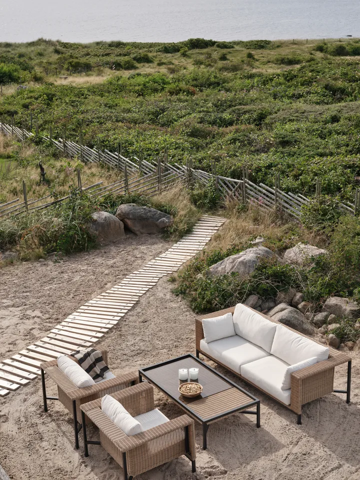 Sofa Shell od Brafab łączy skandynawski i śródziemnomorski design. Dzięki czarnej aluminiowej ramie i białym poduszkom z tkaniny olefinowej, ta sofa oferuje mieszankę prostoty i ciepła. Otwarty tył podkreśla jej elegancką ramę. Sofa Shell to doskonały wybór do zewnętrznej oazy, która przetrwa próbę czasu. Użyj pokrowców na meble dla najlepszej trwałości i ciesz się komfortem oraz estetyką. Idealna do stworzenia przyjaznej atmosfery w ogrodzie lub na tarasie.