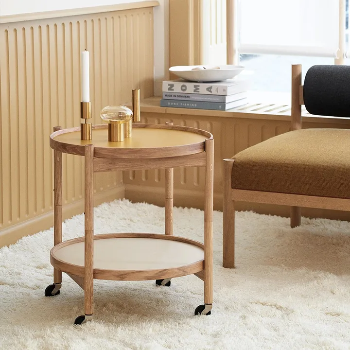 Bølling Tray Table model 50 stół obrotowy od Brdr. Krüger to elegancki stolik z tacami z litego drewna, łączący ponadczasowy design z funkcjonalnością. Zaprojektowany przez Hansa Bøllinga w 1963 roku, stał się ikoną duńskiej historii designu. Dzięki ruchomym kółkom i odwracalnym tacą oferuje elastyczne rozwiązanie do serwowania, przechowywania lub jako stylowy akcent w salonie. Przemyślana konstrukcja ułatwia przenoszenie i dostosowanie do potrzeb, niezależnie od tego, czy jest używany na co dzień, czy podczas przyjęć.