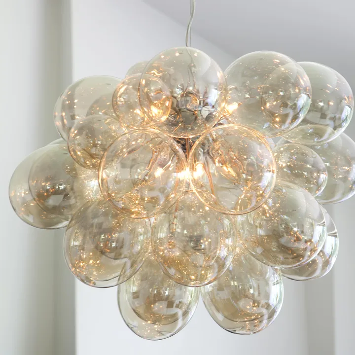 Lampa sufitowa Gross Grande od By Rydéns to elegancka lampa sufitowa złożona z 32 delikatnych szklanych kul, które razem tworzą miękko rzeźbioną całość. Powietrzna forma rozprasza przyjemne, stłumione światło, które wprowadza ciepło i charakter do salonu lub jadalni. Projekt podnosi estetykę pomieszczenia, nie dominując go, a połysk szkła nadaje ponadczasowy charakter, pasujący do wielu stylów wnętrz. Dekoracyjne i funkcjonalne źródło światła, które stanie się pięknym elementem przyciągającym wzrok w domu.