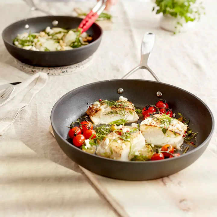 Demeyere Alu Pro 5 Ti-X zestaw patelni oferuje patelnie non-stick, wykonane z tłoczonego na zimno aluminium z 5 mm podstawą dla szybkiego i równomiernego rozprowadzania ciepła. Patelnie wyposażone są w technologię TriplInduc®, co oznacza efektywne działanie na indukcji i 30% oszczędność energii. Powłoka Duraglide Titanium jest odporna na zarysowania i wymaga niewielkiej ilości tłuszczu podczas smażenia. Ergonomiczne uchwyty ze stali nierdzewnej, można myć w zmywarce (zalecane mycie ręczne). Idealne zarówno do kuchni domowych, jak i profesjonalnych do 230 °C. 5-letnia gwarancja.