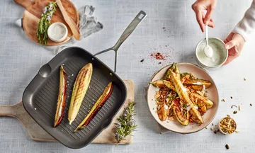 Patelnia grillowa Demeyere Alu Pro jest wykonana z trwałego, pokrytego tytanem aluminium i ma solidny, kwadratowy kształt, który doskonale nadaje się do wszystkiego, od ryb i warzyw po duże steki. Specjalnie obrobiona płyta denną zapewnia doskonałe rozprowadzanie ciepła, a wzór wewnątrz tworzy idealne ślady z grilla. Wyposażona jest w elegancki, ergonomiczny uchwyt ze stali nierdzewnej.