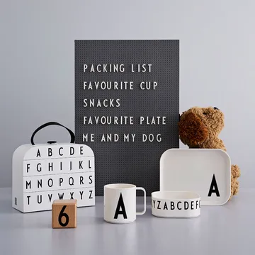 Zestaw Design Letters zastawa stołowa dla dzieci przychodzi w ładnej małej walizce i zawiera talerz, miskę i kubek. Możesz wybrać literę na talerzu i kubku, co czyni zestaw idealnym osobistym prezentem. Miska jest ozdobiona alfabetem (A-Z). Wszystkie części są wykonane z Tritanu, który jest plastikiem wolnym od BPA. Materiał jest bardzo odporny na wstrząsy i nadaje się do używania zarówno w kuchence mikrofalowej, jak i zmywarce.