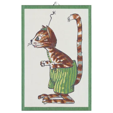 Tkany ręcznik kuchenny z 100% ekologicznej bawełny od zabytkowej przędzalni Ekelund z zabawnym motywem znanym z książek o Pettsonie i Findusie.