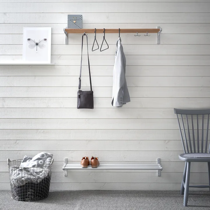 Nostalgi Półka na buty lub kapelusze została zaprojektowana w 1937 roku przez Gunnara Bolina. Półka może służyć zarówno jako półka na buty, jak i na kapelusze i pojawiała się i znikała na przestrzeni dekad, lecz dziś uznawana jest za klasykę szwedzkiego wzornictwa meblowego. Konsolki wykonywane są, jak dawniej, ze stopionych kawałków aluminium połączonych z prętem okrągłym z drewna lub aluminium. Półka dostarczana jest z haczykami, które wykorzystuje się, gdy chce się używać jej jako półki na kapelusze. Zalecamy, by nie wieszać więcej niż dziesięć wieszaków na metr półki na kapelusze. Półkę można przedłużyć za pomocą elementu do zabudowy, dzięki czemu może mieć dowolną długość lub być całkowicie dopasowana wymiarowo przez docięcie prętów okrągłych do pożądanej długości.