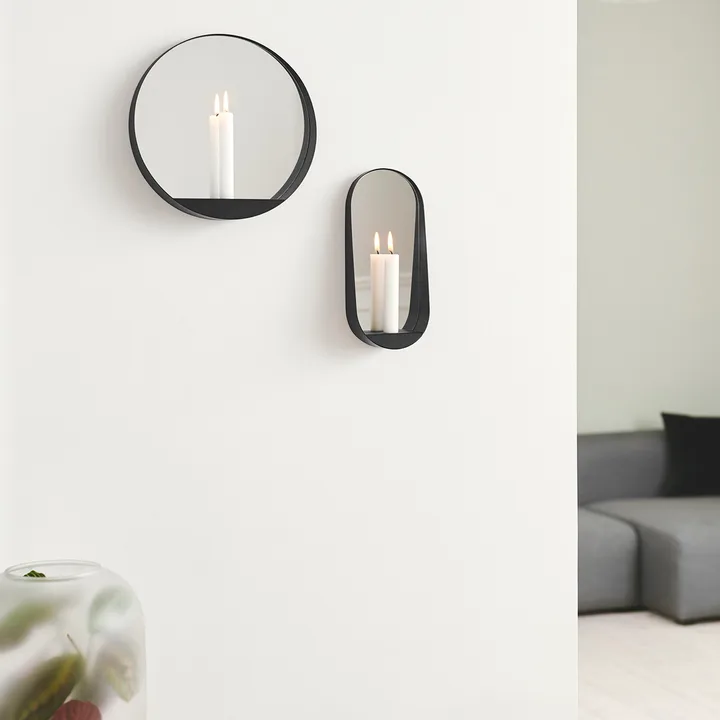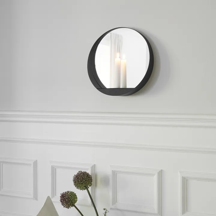 Glim mirror/świecznik Ø28 cm od Gejst to okrągłe lustro z możliwością umieszczenia świecy stołowej. Glim montuje się na ścianie i prezentuje się świetnie wśród obrazów, a także osobno lub w grupie w salonie, przedpokoju, biurze lub sypialni. Glim jest inspirowany starymi latarniami i odbicie światła tworzy przytulną atmosferę.