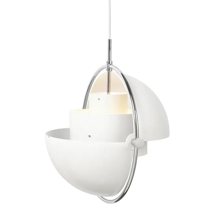 Lampa Multi-Lite od GUBI to ikoniczna lampa wisząca zaprojektowana przez Louisa Weisdorfa w 1972 roku. Charakterystyczny, podzielony klosz można obracać indywidualnie, co pozwala kształtować światło dokładnie tak, jak chcesz — w górę, w dół lub asymetrycznie. Dzięki sprytnej konstrukcji z dwiema cylindrycznymi formami i metalowym pierścieniem lampa jest zarówno dekoracyjna, jak i funkcjonalna, idealna nad stołem jadalnym lub w salonie, gdzie chcesz stworzyć nastrój lub skupione oświetlenie. Ponadczasowy element, który pozwala dostosować atmosferę do bieżących potrzeb.