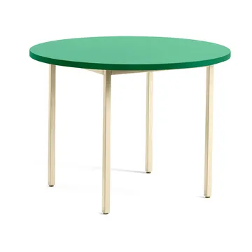 „Two-Colour matbord Ø105 cm od HAY jest zaprojektowany przez Muller Van Severen. Ten stół łączy solidne stalowe nogi z blat w kolorowym Valchromat, co odzwierciedla miłość projektanta do materiałów i ich naturalnego piękna. Różne komponenty kolorystyczne tworzą harmonijną równowagę między kontrastem a podobieństwem, co czyni stół unikalnym i oryginalnym wyrazem. Dostępne w różnych kształtach, rozmiarach i kombinacjach kolorystycznych dla osobistego akcentu. Idealny do stworzenia eleganckiego i wyrazistego kontekstu jadalni.”