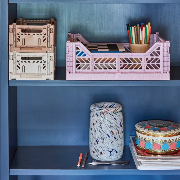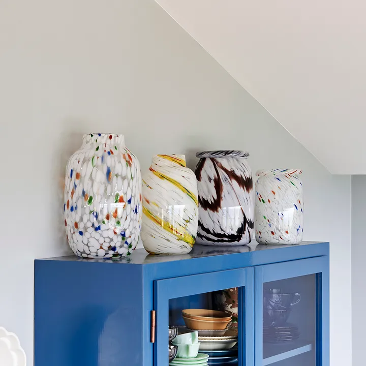 Wazon Splash Roll Neck M 22 cm od HAY to ręcznie wykonany wazon z wyraźnym, spiralnym wzorem stworzony dzięki unikalnej technice dmuchania szkła, w której nakładane są kolejne warstwy kolorowych kropek szkła. Wazon sprawdza się zarówno z dzikim bukietem, jak i samodzielnie na półce jako artystyczny obiekt designerski. Dzięki starannemu wykonaniu każdy egzemplarz ma drobne, urokliwe różnice, które podkreślają indywidualny wyraz. Idealny dla tych, którzy chcą dodać wnętrzu charakteru i artystycznego akcentu.