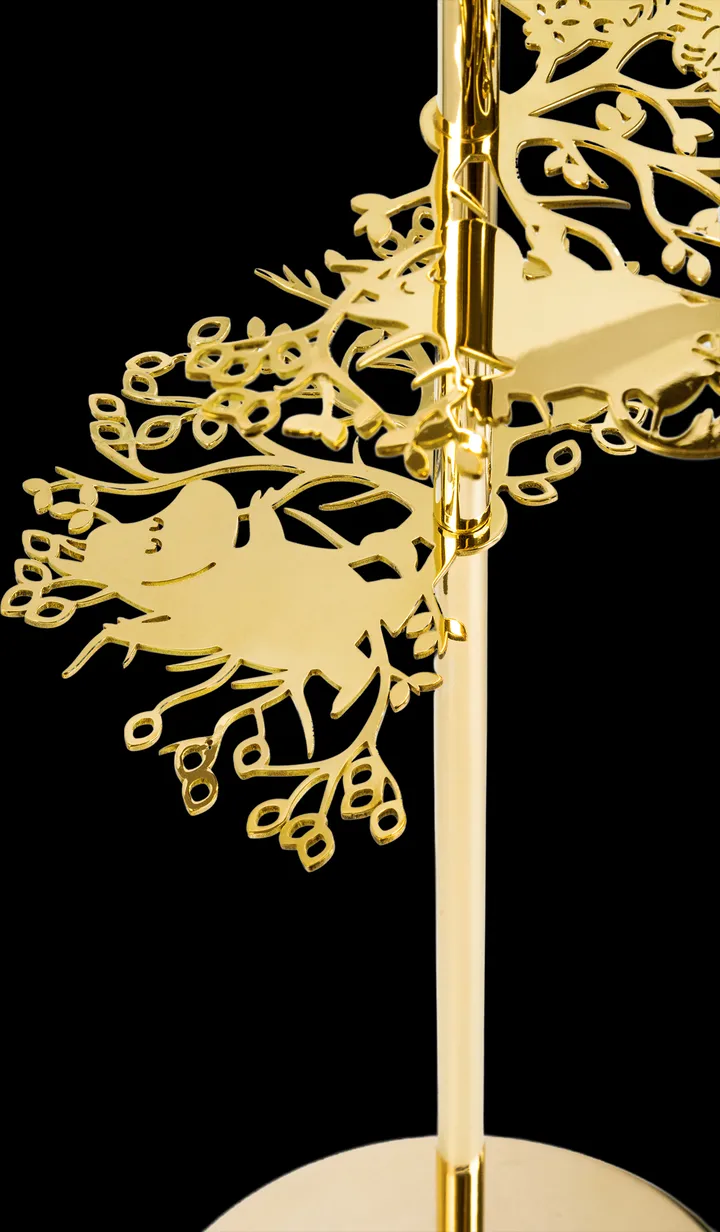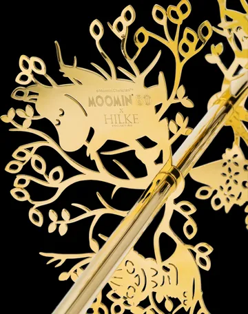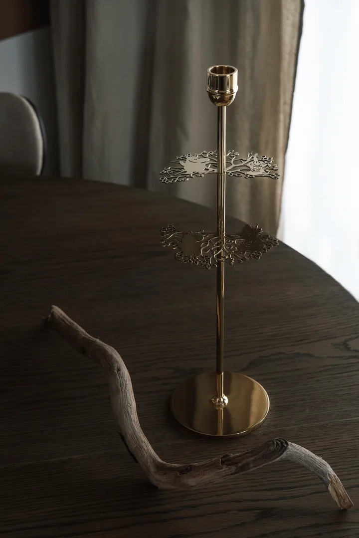 Świecznik Hilke X Mumin No.2 od Hilke Collection to unikalny świecznik mosiężny inspirowany opowieścią Tove Jansson o rodzinie Muminków. Gałęzie drzewa symbolizują rozdzieloną rodzinę, ale tworzą pełne koło z góry. Postacie z Muminków subtelnie ukrywają się w projekcie.