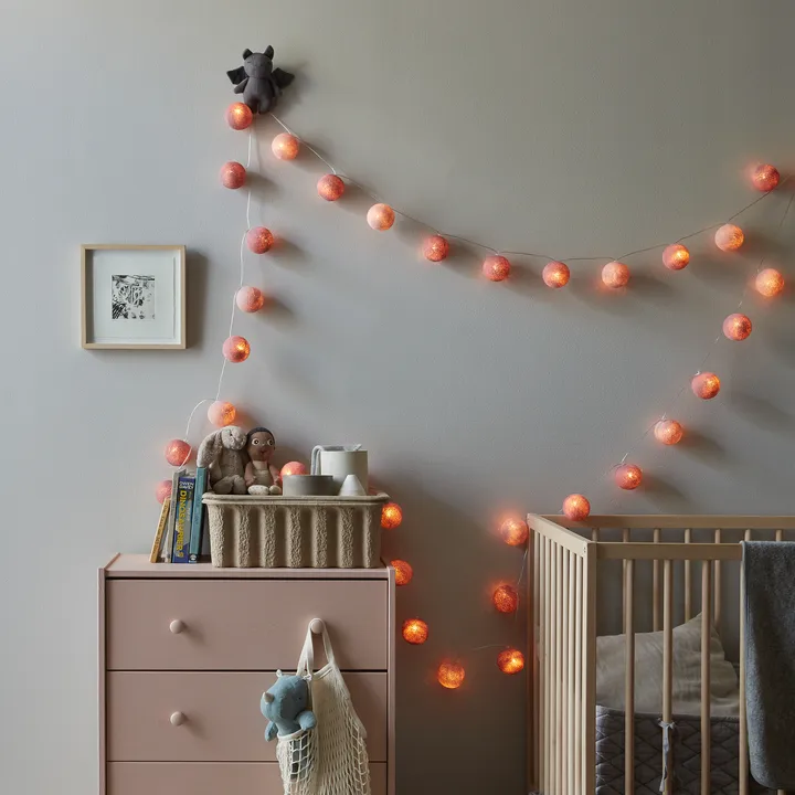 Sznur świetlny French rose od Irislights rozprzestrzenia romantyczną atmosferę dzięki swoim dwóm odcieniom różu i przytulnym, ciepłym światłom. Kule są ręcznie wykonane z bawełny, naturalnego kleju i cienkiej, ręcznie barwionej nici. Powieś go wokół lustra, udekoruj stół obiadowy lub ukształtuj sznur świetlny w serce i przymocuj do ściany. Irislights French rose będzie rozpraszać światło i tworzyć ciepłe uczucie bez względu na to, w którym pomieszczeniu zdecydujesz się go powiesić.