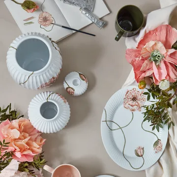 Świecznik Hammershøi Poppy od Kähler ma romantyczny motyw kwiatowy przedstawiający maki wzdłuż klasycznego wzoru Hammershøi. Seria skupia się na delikatnych makach, które projektantka Rikke Jacobsen tak pięknie namalowała akwarelą, stąd nazwa „Poppy”, co oznacza mak po angielsku. Konstrukcja świecznika sprawia, że nadaje się zarówno do świec, mniejszych gałązek, jak i pojedynczych kwiatów.