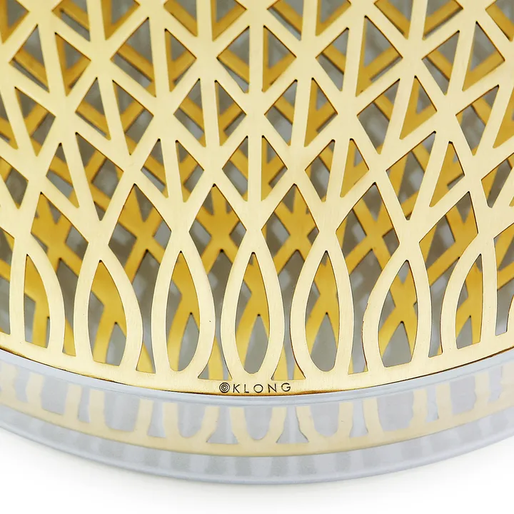Wazon Äng, mega od KLONG to okazały wazon z kolekcji Äng zaprojektowany przez Evę Schildt. Ustępujący formie dmuchanego szkła spoczywa w ręcznie wykonanym metalowym stelażu, który działa jak wbudowane wsparcie dla kwiatów — idealne, aby nadać ciętym kwiatom strukturę i życie. Każdy metalowy wzór jest unikalny, ponieważ wykonywany jest ręcznie, co sprawia, że każdy wazon jest osobisty. Mosiądz jest lakierowany, by wytrzymać kontakt z wodą; czyść go z soku roślinnego i często zmieniaj wodę, aby zachować wykończenie. Piękne połączenie rzemiosła i funkcji, które podkreśla bukiet w domu.