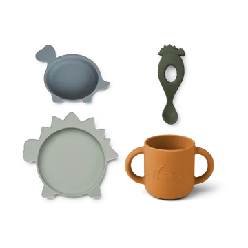 Zestaw naczyń z silikonu Vivi 4 części od Liewood jest wykonany z trwałego silikonu i oferuje bezpieczne oraz kolorowe doświadczenie podczas jedzenia. Ten zestaw naczyń zawiera kubek, miskę, talerz oraz łyżkę – to trwała alternatywa dla plastiku i porcelany, idealna na posiłki dla małych dzieci.