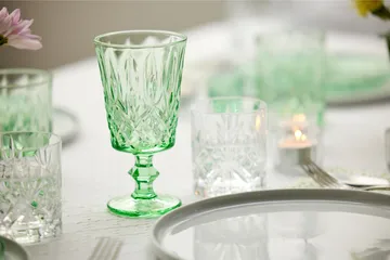 Kieliszki do wina Sorrento 29 cl 4-pack od Lyngby Glas są wykonane z barwionego szkła z pięknymi fasetami, które chwytają światło. Te kieliszki mają charakterystyczny krótki trzonek, co nadaje im wyjątkowy charakter. Idealne do wina, innych napojów lub do serwowania deserów.