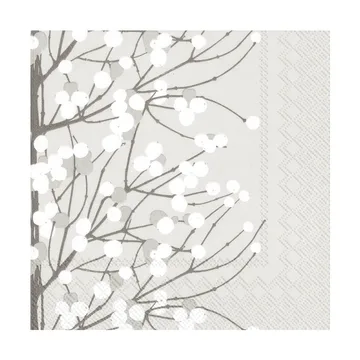 Serwetka papierowa z wzorem Marimekko Lumimarja narysowanym przez Erję Hirvi w 2004 roku. Zimowy wzór z gałązkami i jagodami idealnie współgra z nakryciem inspirowanym naturą. Jedno opakowanie zawiera 20 serwetek wykonanych z papieru posiadającego certyfikat FSC. Każda serwetka składa się z trzech warstw, co nadaje im jakościowy charakter.