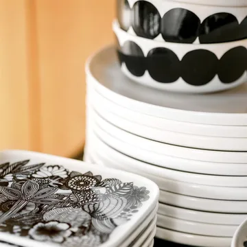 Räsymatto miska od Marimekko została zaprojektowana przez Maija Louekari i prezentuje zabawny, graficzny wzór, który ożywia nakrycie stołu. Wykonana z porcelany, miska jest wystarczająco wytrzymała do codziennego użytku – nadaje się do zmywarki, zamrażarki i mikrofalówki. Użyj jej do owsianki, sałatek lub jako stylowej miski do serwowania przy mniejszych okazjach. Wszechstronny i uroczy dodatek do kuchni, który sprawia, że każdy posiłek jest nieco radośniejszy.