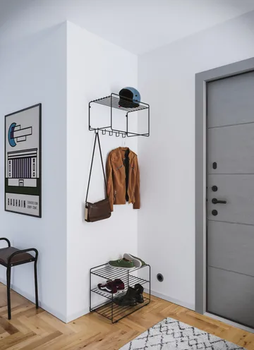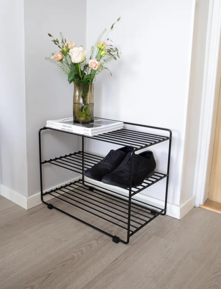 Regał na buty Downtown od Maze ma minimalistyczny design inspirowany stylem funk. Wykonany jest z drutu metalowego, pokrytego farbą proszkową. Materiał półki jest częściowo z recyklingu, co czyni ją zrównoważonym wyborem pod względem trwałości i ekologii. Regał na buty Downtown wprowadza elegancki akcent do domu i pasuje nawet do najmniejszego korytarza dzięki swoim smukłym wymiarom.