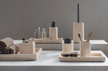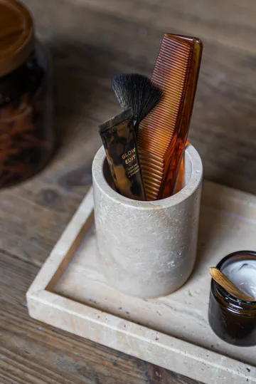 Kubek na szczoteczkę do zębów Travertine 10 cm od Mette Ditmer łączy funkcjonalność i estetykę w eleganckim designie. Wykonany w 100% z travertynu, znanego z naturalnych wzorów i tekstur, czyniąc każdą sztukę unikalną. Idealny do organizacji szczoteczek do zębów lub pędzli do makijażu, dodając elegancji w łazience.