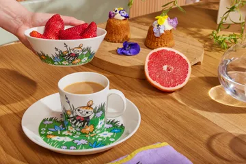 Miska Muminki Mała Mi na łące od fińskiej Arabii jest wykonana z trwałej białej porcelany i przedstawia Małą Mi na zielonej trawie otoczoną kwiatami. Ilustracja została narysowana przez Tove Slotte i opiera się na uwielbianych oryginalnych rysunkach Tove Jansson o Muminkach i ich przyjaciołach. Mała Mi jest odważna i nieustraszona, a tutaj widzimy ją podziwiającą nową dużą gwiazdę świecącą na niebie, która zmierza w stronę Doliny Muminków. Rzuca się na łąkę, by zobaczyć kometę. Mała Mi uwielbia małe katastrofy! Miska dzięki swojemu rozmiarowi nadaje się równie dobrze do porannego jogurtu, jak i do deserowego lodu i chętnie jest łączona z inną porcelaną Muminki tej samej marki.