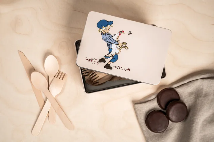 Puszka Emil 18x12x6 cm od Muurla jest wykonana z solidnej blachy i ozdobiona wizerunkiem psotnego, ale kochanego Emila z Lönnebergi, zaprojektowanym przez Kata Nowak-Kiminki. Z Emilem bawiącym się wśród kur w Katthult, ta puszka z pokrywką może być używana do przechowywania drobiazgów i skarbów w pokoju dziecięcym, na biurku lub w kuchni.