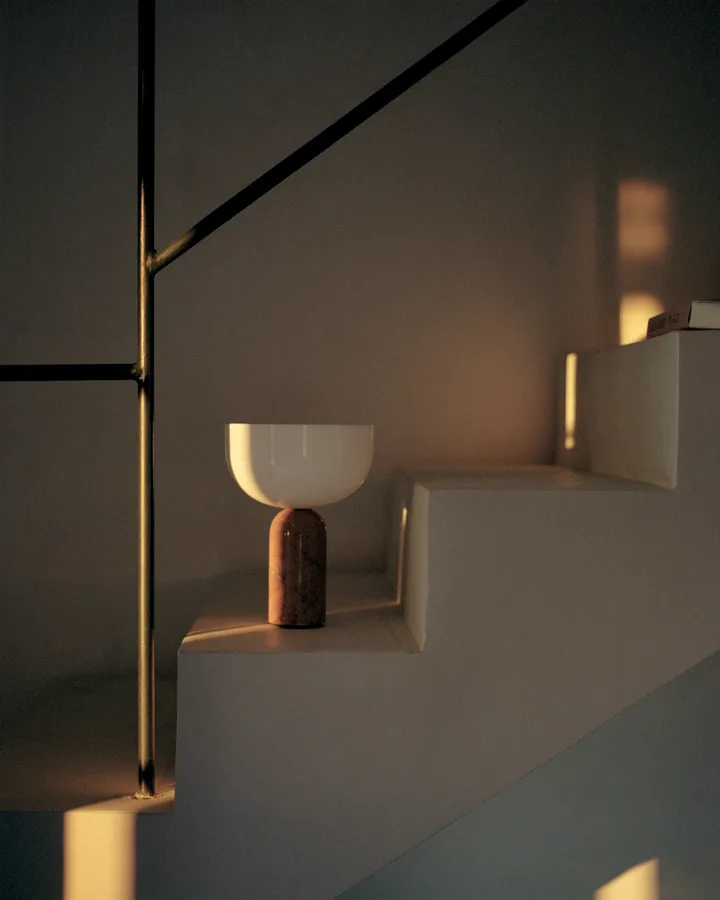 Lampa stołowa przenośna Kizu od New Works to przenośna lampa zaprojektowana przez Lars Tornøe, która przyciąga wzrok swoją rzeźbiarską formą. Mobilna wersja jest łatwa do przeniesienia tam, gdzie potrzebne jest światło, i daje stabilne wrażenie dzięki elementowi z marmuru, który jest ciepły i przyjemny w dotyku. Skręcony, wgłębiony metalowy okrąg na górze pełni funkcję ściemniacza w trzech krokach, umożliwiając łatwe tworzenie nastroju. Do 10 godzin pracy na baterii przy najwyższym poziomie jasności i wygodne ładowanie przez USB‑C czynią Kizu portable idealnym do wieczorów w salonie, na balkonie lub jako nastrojowe światło do czytania.