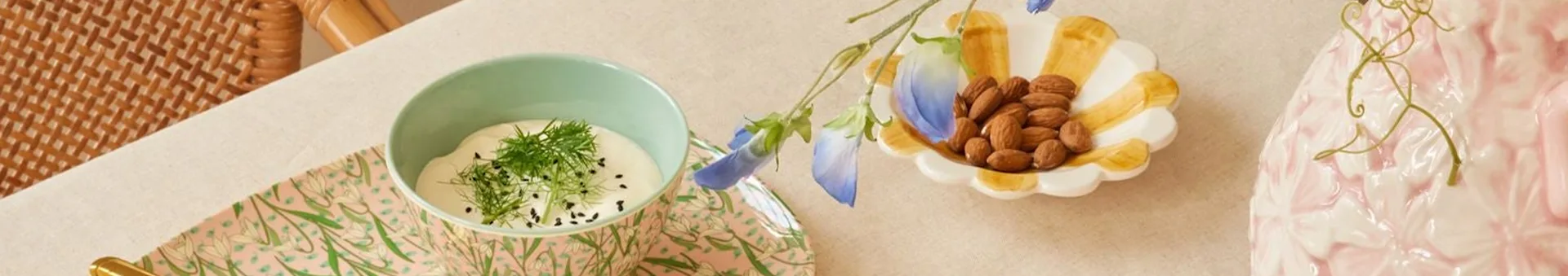 Kolorowe produkty z melaminy, ręcznie robione kosze do przechowywania i ręcznie szkliwiona porcelana.