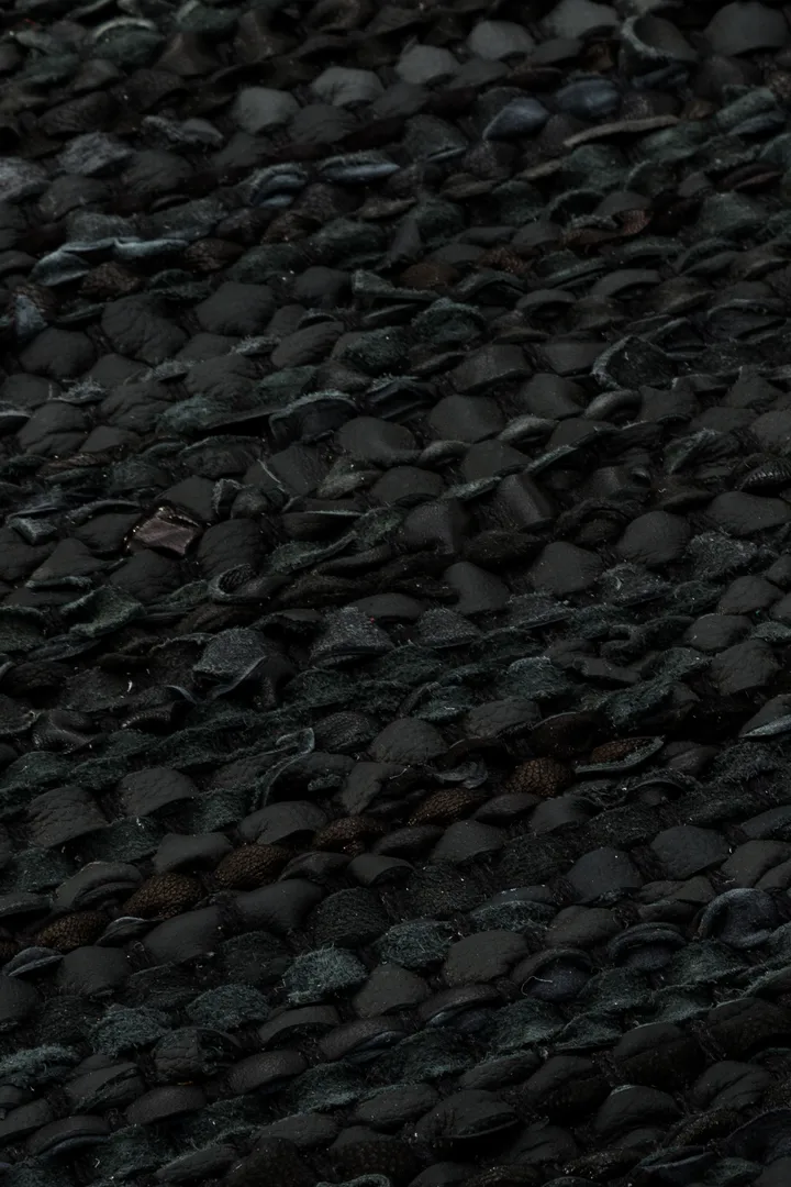 Stylowy ręcznie tkany dywan ze skóry naturalnej, wykonany z resztek materiałów z przemysłu modowego. Dywan jest w odcieniach czerni i ma powściągliwy design, dzięki czemu pasuje do większości rodzajów wnętrz. Dzięki ekskluzywnym materiałom użytym do stworzenia dywanu oraz procesowi produkcji, dywan jest równie wysokiej jakości, jak wygląda. Idealny dla tych, którzy cenią sobie minimalistyczny i powściągliwy styl.