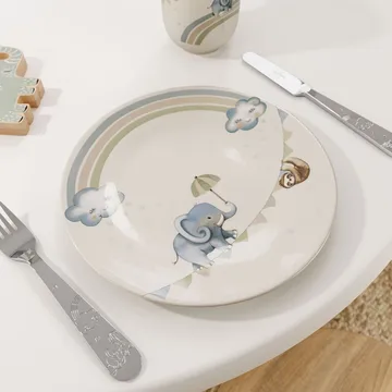 Talerz dziecięcy „Walk Like an Elephant” Ø21,5 cm od Villeroy & Boch jest wykonany z porcelany. Ten talerz jest częścią kolekcji Boho Kids i zdobi go uroczy słoń oraz jego przyjaciel leniwiec, co sprawia, że każdy posiłek jest dla dzieci wesołym doświadczeniem.