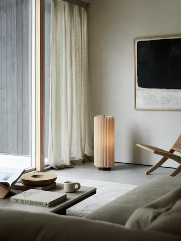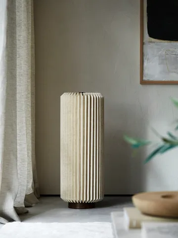 Lampa podłogowa Alba od Watt & Veke oferuje delikatne światło dzięki plisowanemu kloszowi z lnianego materiału. Podstawa z ciemno barwionego drewna mango tworzy harmonijny kontrast z materiałowym kloszem. Lampa jest wyposażona w luksusowy przewód tekstylny dla stylowego efektu.