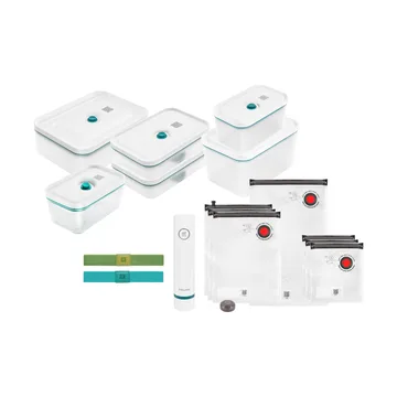 Próżniowy zestaw startowy La-Mer, plastik z serii Fresh & Save firmy Zwilling gwarantuje, że Twoje jedzenie pozostanie dłużej świeże. Dzięki bezprzewodowej pompie próżniowej, ładowanej przez USB, i dołączonym pojemnikom BPA-free w rozmiarach S i M oraz czterem wielokrotnego użytku woreczkom, możesz łatwo zachować smak i wartości odżywcze. Pompa próżniowa jest prosta w użyciu: umieść ją na zaworze i naciśnij przycisk, aby odessać powietrze. Pojemniki i woreczki są odporne na chłód, zamrażanie i mikrofalówkę, a woreczki są zatwierdzone do sous-vide do 100 °C.