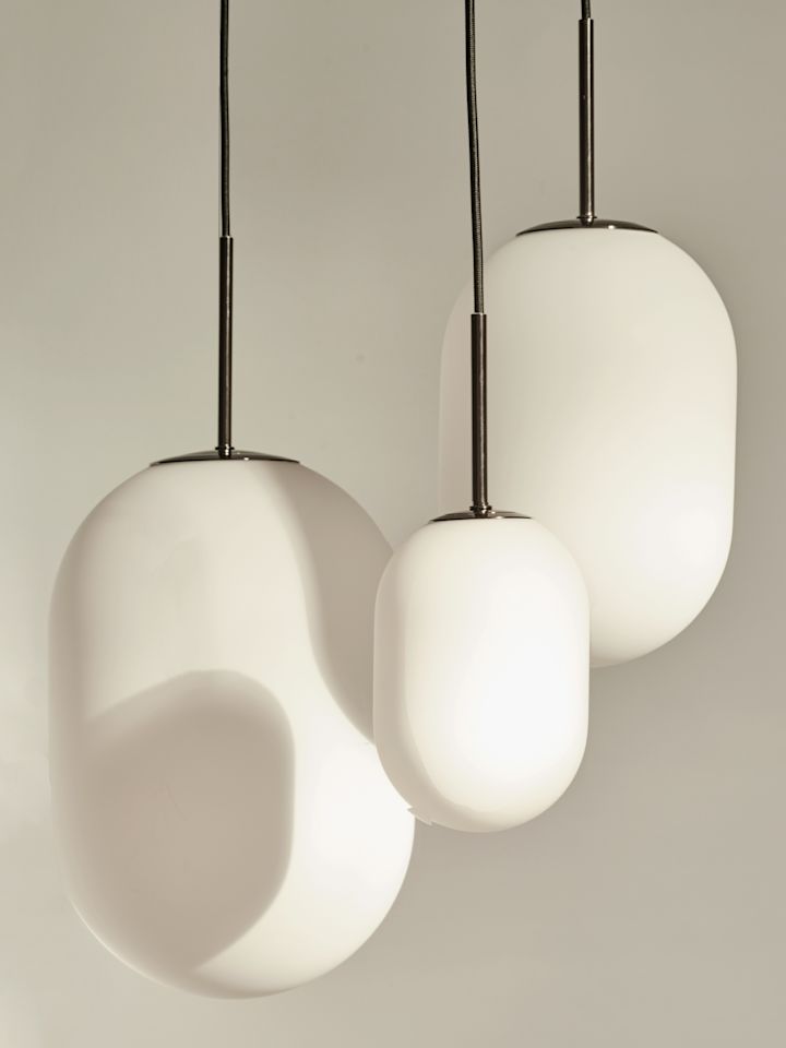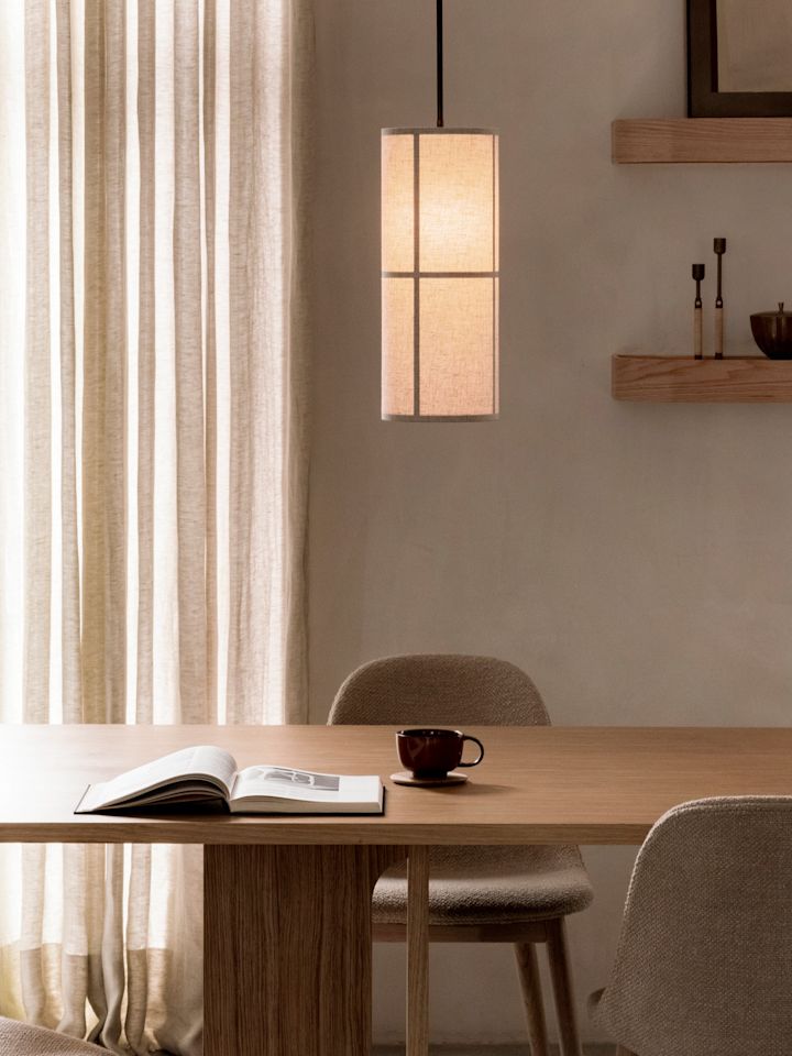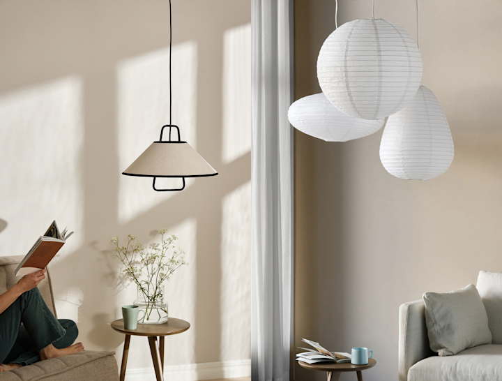 Lampa wisząca Dokka od Northern skieruje swoje światło w dół ze względu na kształt stożka klosza, podczas gdy sferyczna lampa wisząca wykonana całkowicie ze szkła, jak lampa Luna od Design House Stockholm, rozprowadzi swoje światło bardziej równomiernie po całym pokoju.